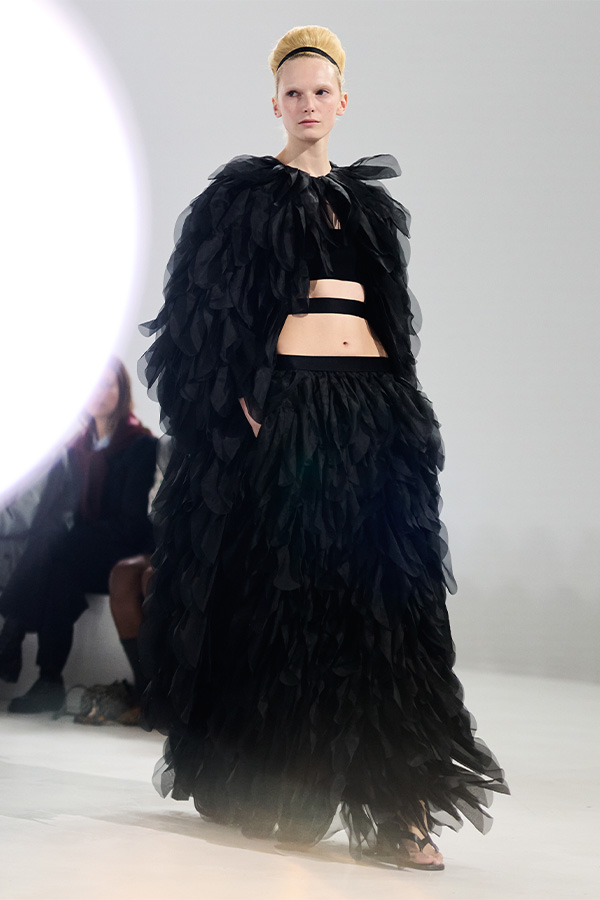 Zu den Stars dieser Show zählen ein voluminöser Kamm, der die Konturen eines ansonsten strengen Bleistiftrocks nachzeichnet, ein Organzarock, der aus Hunderten geschnittener und gefalteter Teile besteht, wie die Blütenblätter einer exotischen Treibhausblüte; ein flotter Trenchcoat verwandelt sich in ein elementares Statement, wie das Gefieder eines fantastischen Vogels. Und tadellos geschnittene Jacken, tief sitzende Hosen, elastische Gürtel und Riemen offenbaren eine innere Logik, die so scharfsinnig ist wie der Witz von Mme de Pompadour. Die Essenz der aus der Natur geschöpften Inspiration der Rokoko-Motive findet sich in kunstvollen Prints wieder, die auf mehreren Lagen hauchzarter Organza aufgebracht sind. Max Mara zieht in dieser Kollektion einen überraschenden Bogen zwischen Vergangenheit und Gegenwart.