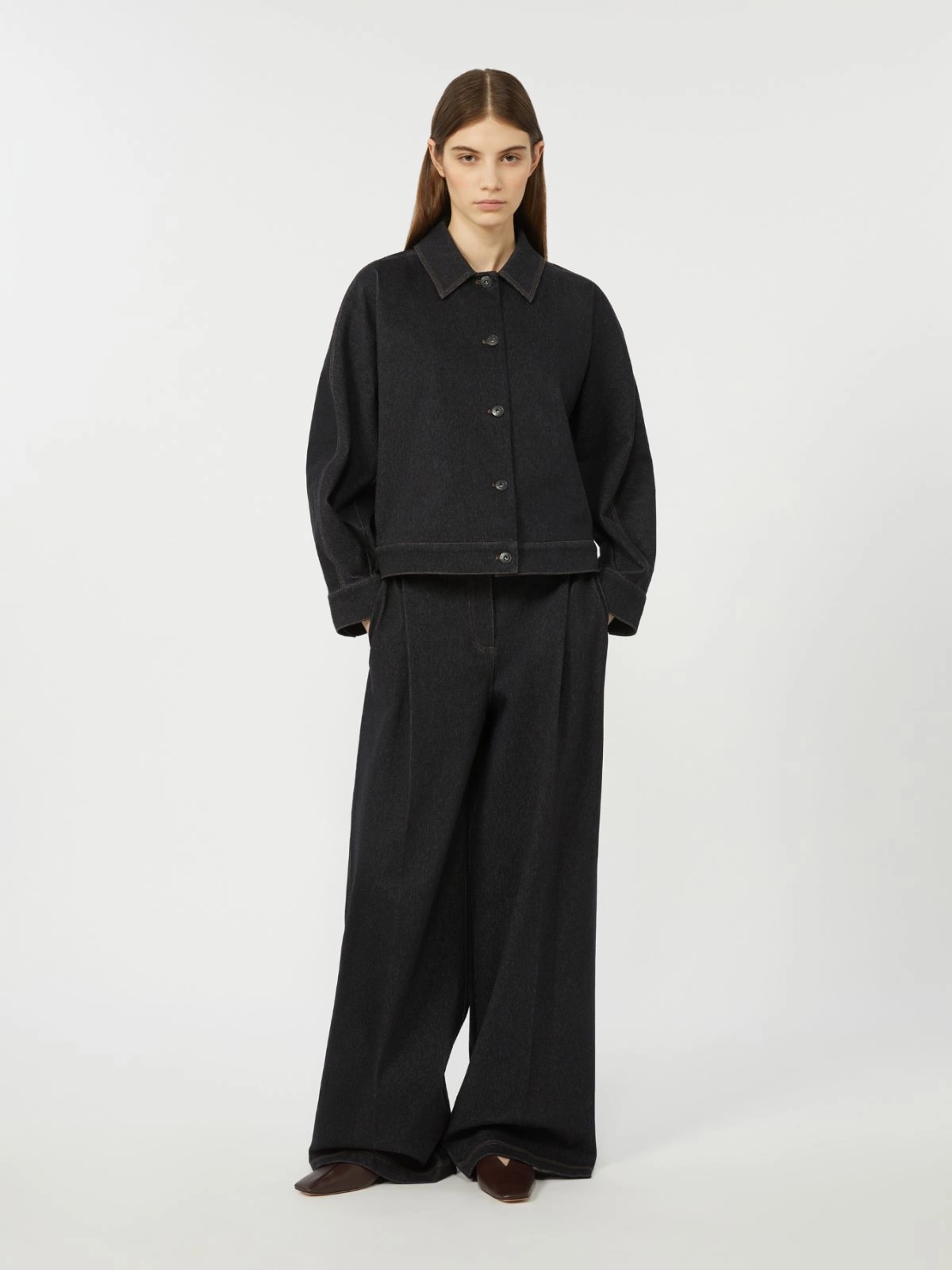 Hose mit weitem Bein mit ikonischen Denim-Details: galvanisierte Metallnieten in Vintage-Optik und lederfarbene Nähte.