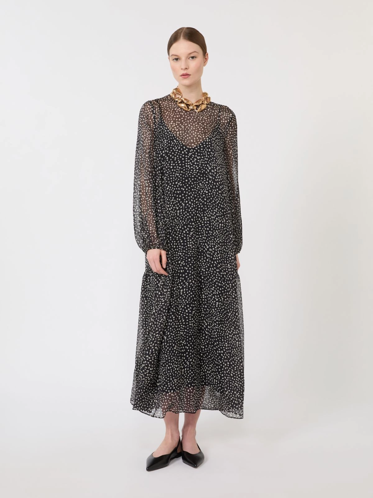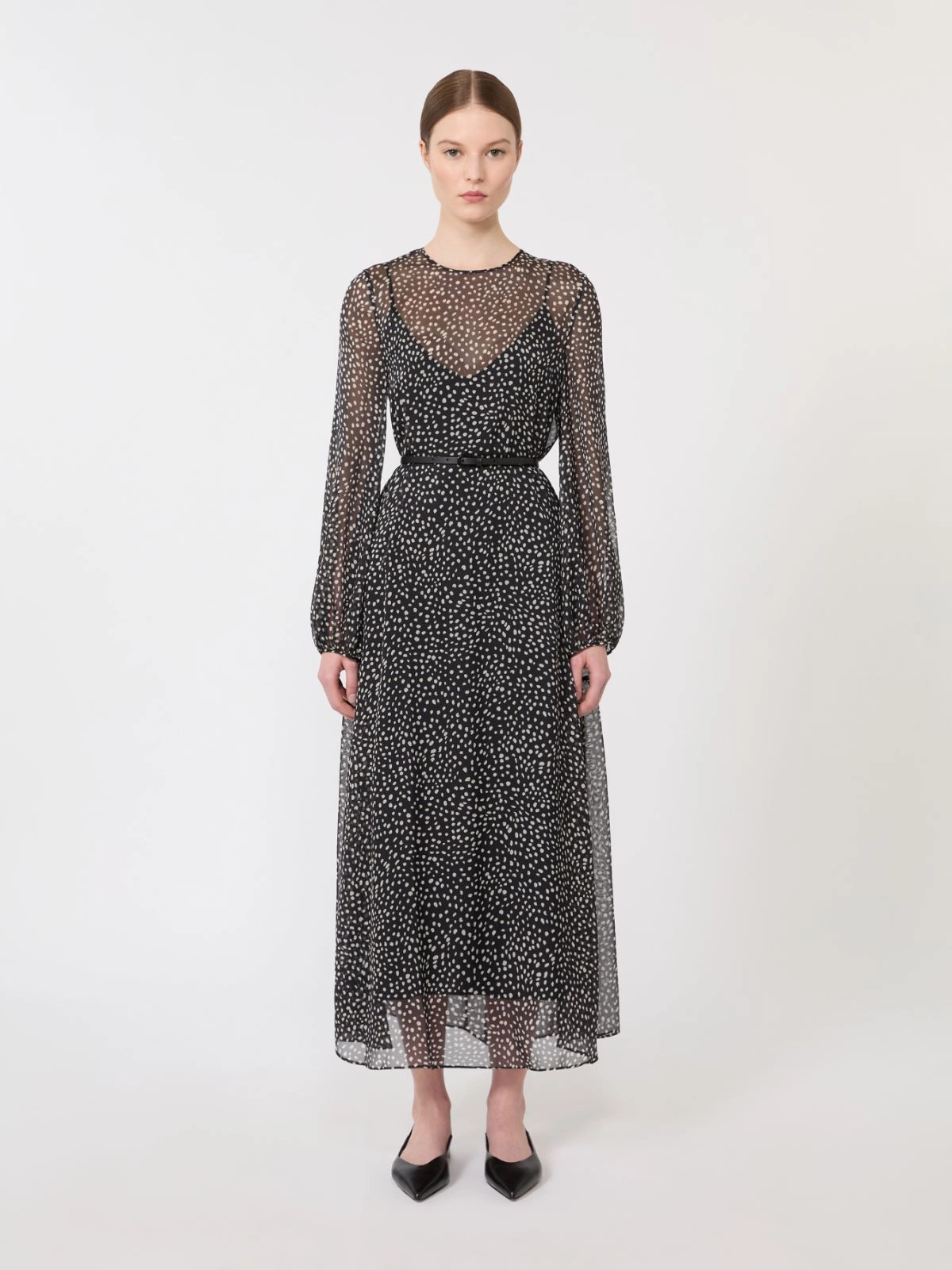 Kleid stoff 100% seide; gurtel aus rind, polyester mit polyrethansbelag. Unterkleid 85% acetat, 10% seide, 5% polyamid.